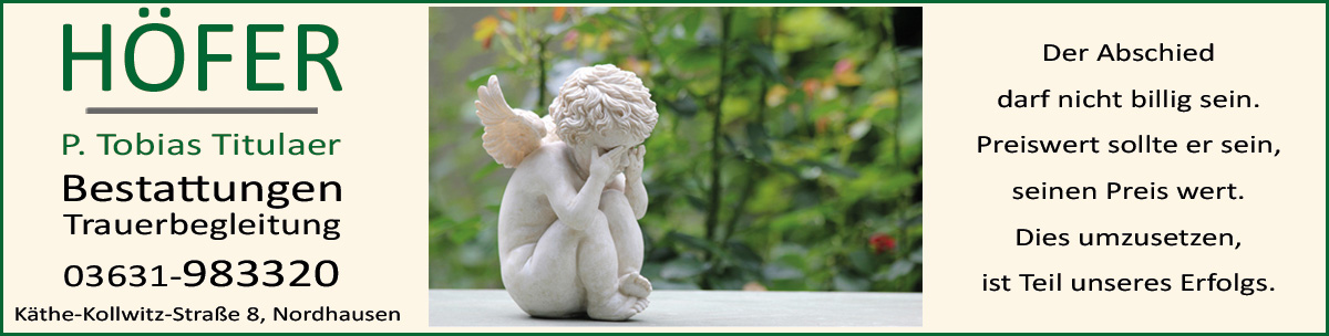 Das Bestattungshaus HÖFER steht in Nordhausen und Umgebung für eine lange Tradition sowie Kompetenz und Erfahrung in der Durchführung von Bestattungen. Gleichzeitig sind wir aber auch dafür bekannt, ständig neue Wege in der Trauerkultur und Trauerbegleitung zu verwirklichen. Uns deshalb auf Erd-, Feuer-, Seebestattung und die Übernahme aller Formalitäten zu beschränken, ist uns zu wenig. Wir suchen mit Ihnen zusammen nach Wegen und zeigen Möglichkeiten auf, die Ihnen Stütze und Hilfe in ihrem persönlichen Abschied sein können und dies muss dann nicht sofort teuer sein.